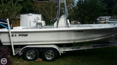 A white boat with the name 'Sea Pro' on the side is parked on a trailer. The boat has a white interior with a steering wheel and a seat. The trailer is on a grassy area with a small tree in the background. | Sea Pro 22, 22', for sale - $28,400 | 2b01a65f061158e9f9f08429e7ae4bf4a09d59f6f304177e77dfa187633b928d | 001229711435 | 0 | 0 | 43 | 8 | 0 | 0 | |