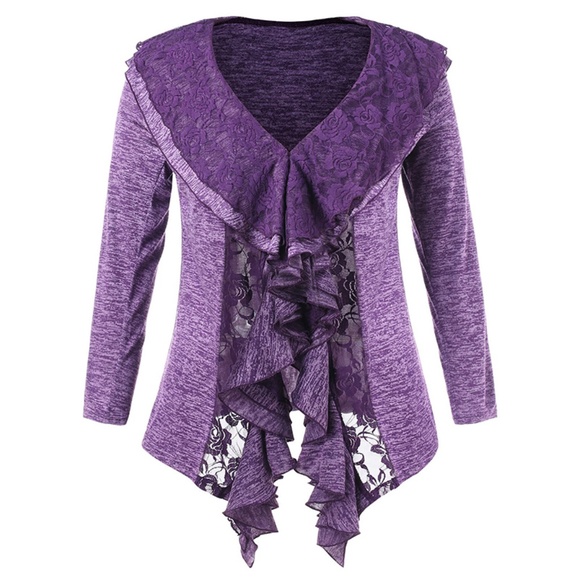 A purple top with a ruffled design on the front and a V-neckline. The top has long sleeves and is made of a stretchy material. | Rosegal for Curves Collection Sweaters | Plus Size Purple Ruffle Lace ... | 738c44f4ef4e15a5d5e967a1feb013ee57e2a17f7006a40fddfe44726c14bbbc | 001229711863 | 0 | 0 | 25 | 12 | 0 | 0 | |