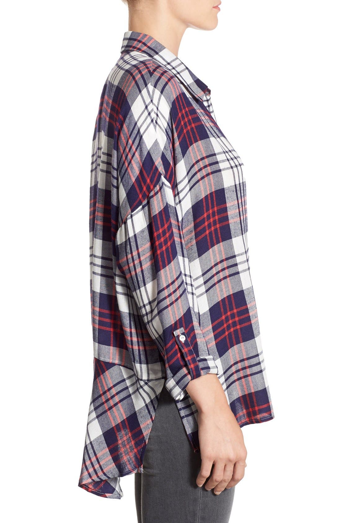 A woman wearing a purple and grey checkered shirt and grey pants. | BOBEAU,\n Split Back High/Low Plaid Shirt,\n Alternate thumbnail 5, color,\n 400 | f60af10f32414105962c0b41bd11cf4d325a7bb40c70ba3410c4e1347c02cc55 | 001229711785 | 0 | 0 | 12 | 11 | 0 | 0 | |