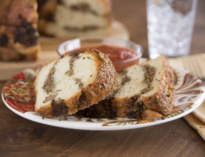 A slice of bread with a generous amount of ketchup on top is placed on a white plate with a floral pattern. The plate is on a wooden surface, and there is a glass of water to the right of the plate. In the background, there is a piece of bread on a wooden cutting board and a fork to the right of the plate. | Zesty Sausage Bundt | 664cb4cb84f051649826c0a14be1d35e17c75e779867f90bb44df2f16f86a268 | 001229711778 | 0 | 0 | 65 | 3 | 0 | 0 | |
