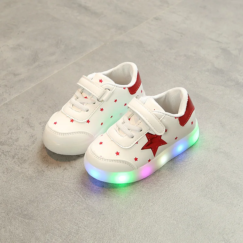 A pair of white sneakers with red accents and a star design on the side is placed on a grey floor. The sneakers have a glowing effect on the soles, giving them a neon appearance. | 2018 new casual flat shoes girls boys led casual sneakers shoes star glowing light flush children sneakers baby flat sneakers | cd922555ac45649bc96f628265f710738a19fd7e660b45325808610bd9710d0f | 001229712002 | 0 | 0 | 35 | 20 | 0 | 0 | |
