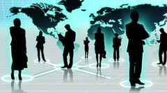 The second image shows a group of silhouetted figures standing in a line, facing a large, detailed map of the world. The figures are positioned in a way that suggests they are observing the map. The map is centered in the image, with the figures on either side. The background is a plain, light color, and the overall image has a clean, modern aesthetic. | 3D Images People Connecting Global Social Business Networking Sites - stock footage | 5bcdef10e2f4ce27a663714f4eabe9b1e2d409d4939c9e7d2e80ae83579954f3 | 001229712047 | 0 | 0 | 64 | 12 | 0 | 0 | |