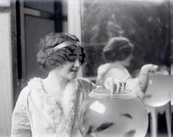 A black and white photograph of a woman with a vintage hairstyle, wearing a frilly dress and a headband, holding a fishbowl with her right hand. The fishbowl contains several goldfish. The woman is standing in front of a mirror, and her reflection is visible in the mirror. The image has a sepia tone, giving it an old-fashioned appearance. | vintage photo Print Artist Model French Model Gazes in Fish Bowl 1900 | 332bb523e3fdfdd2446bfaf2e0db930a5e173f1a3e6b12c82882749f837cf3b3 | 001229711900 | 0 | 0 | 59 | 12 | 0 | 0 | |