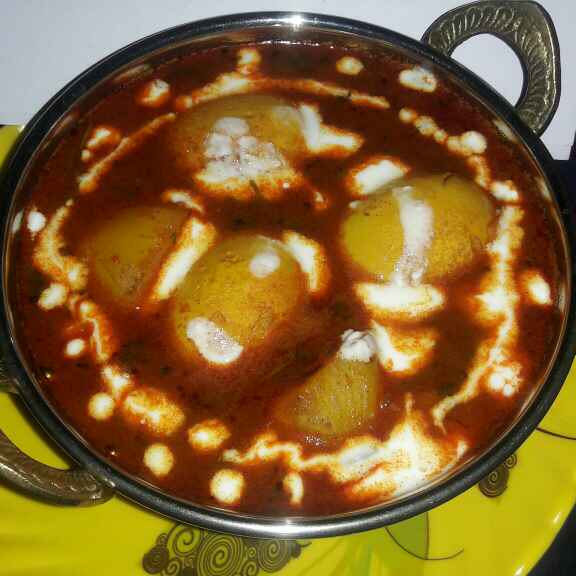 A bowl of stew with several pieces of meat and potatoes, covered in a rich brown sauce. The stew is garnished with white sauce and has a slightly bubbly texture. The bowl is placed on a yellow plate with a decorative border. | How to make Egg Potato Curry...Bengali style | cf69c14bc8323d7c5f1ef365a0935c44b7bf5306fd07f6d3bb48407eeb263107 | 001229711868 | 0 | 0 | 42 | 7 | 0 | 0 | |