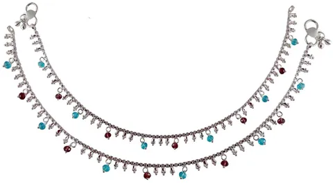 A silver necklace with a mix of blue and red gemstones is displayed against a white background. | Red Blue Dropper Alloy Payal For Women | 6e9e1ef38920cc9d8b4bacd5036f060a92b229149150e6fe1466f7e8e12529ad | 001229712196 | 0 | 0 | 17 | 7 | 0 | 0 | |