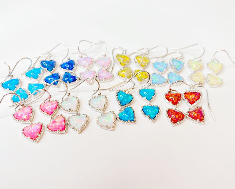 A collection of heart-shaped earrings with various colors and designs is displayed on a white background. The earrings are arranged in rows, with each row featuring a different color scheme. The first row has blue and pink hearts, the second row has yellow and blue hearts, the third row has red and yellow hearts, and the fourth row has blue and red hearts. The earrings have a shiny, metallic finish and are adorned with intricate details and patterns. | BAR exclusive Opal Heart EARRINGS! - 10 Colors! | c83de72f84bcdd262ee97cb27b1264a4add23a13fa3cfff893943fdd47b75786 | 001229712069 | 0 | 0 | 78 | 8 | 0 | 0 | |