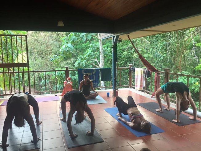 A group of people is practicing yoga on mats in a room with a view of a lush green forest. The room has a wooden floor and a ceiling with wooden beams. There are towels hanging on the wall, and a blue yoga mat is placed on the floor. The participants are in various yoga poses, and there is a woman in the foreground wearing a black tank top and black leggings, performing a yoga pose with her hands on the ground. | 15 Days Wipe Out Surf and Yoga Retreat Costa Rica | 8a6c8da90e8783b32729a610798aaf101fa97826694f53d04e34052c34d4fcd9 | 001229712301 | 0 | 0 | 82 | 10 | 0 | 0 | |