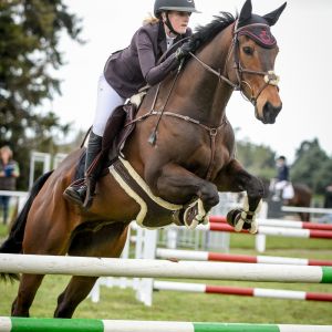 A person is riding a brown horse over a hurdle in an equestrian event. The rider is wearing a helmet, a dark jacket, and riding boots. The horse is wearing a bridle and has a red and white saddle pad. The scene is set in an outdoor arena with a green and white hurdle in the foreground and a crowd of spectators in the background. | Horse for sale: Super young Show Jumper and Hunter | adc5938183d14313901f29d40a7cc07c606e957416715fccc34c911aeabcad7a | 001229712156 | 0 | 0 | 65 | 9 | 0 | 0 | |