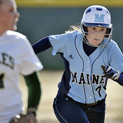 A female softball player is running on the field, wearing a blue and white uniform with the word 'MAINE' on the front. She has a white helmet with a blue 'M' logo on it. The player is in motion, with her right arm extended forward and her left arm back, holding a baseball glove. The background shows a blurred figure of another player, suggesting a fast-paced game. | Black Bear bats come alive in win over Husson | e577c630e0a8bbf3ab56b91c393775b562720af248c8597c267a727e58d97a04 | 001229712422 | 0 | 0 | 67 | 9 | 0 | 0 | |