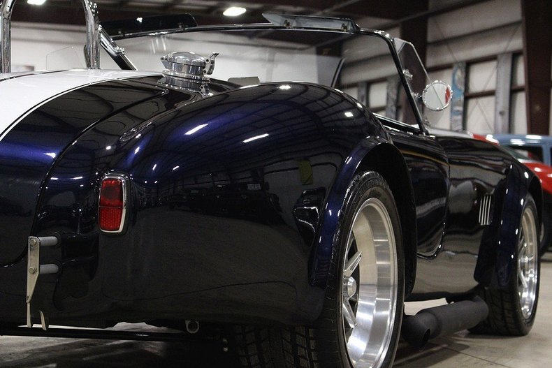 A blue vintage car with a shiny chrome bumper and a classic design is parked in a garage. The car has a distinctive front grille and a curved windshield. The garage has a concrete floor, and there is a red car visible in the background. | 1965 1965 Shelby Cobra For Sale | 63d3bb17612387b0e258be45bc385a2dde5723cf3fa6020e985e9fe6725e72ce | 001229712437 | 0 | 0 | 45 | 6 | 0 | 0 | |