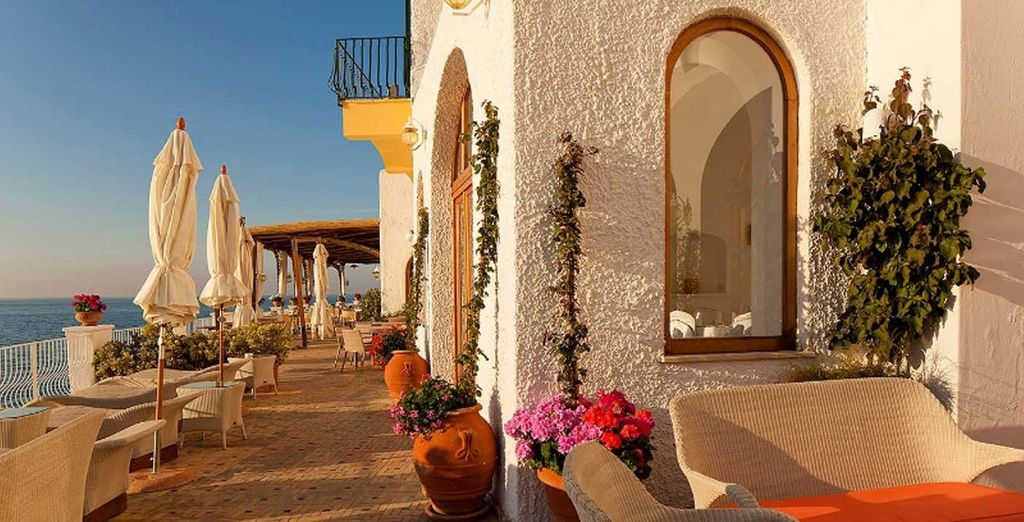 A Mediterranean-style balcony with white walls and a terracotta tiled floor. The balcony is adorned with lush greenery, including ivy climbing up the walls and potted plants. There are several white patio umbrellas providing shade, and a wooden table with chairs is set up for outdoor dining. The balcony overlooks a calm sea with a clear blue sky above. | This supreme resort - Miramare Sea Resort & Spa**** - Ischia - Italy Ischia | b191bc1d06c10c699420a15235d159f23626cc20b856c92d610b6534e7ab9df3 | 001229712221 | 0 | 0 | 59 | 14 | 0 | 0 | |