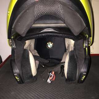 The first image shows the interior of a motorcycle helmet with a black and yellow color scheme. The helmet is placed on a surface with a black and grey pattern. Inside the helmet, there is a BMW logo on the padding, and a small keychain with a red and silver design is visible. The helmet's padding is white, and the overall appearance is clean and well-maintained. | Touratech BMW / Schuberth C3 Helmet | 11005b5e8a3a311f10bb3159371f2fcedbb7cf574b65a67e26f56d991aec187d | 001229712474 | 0 | 0 | 66 | 6 | 0 | 0 | |