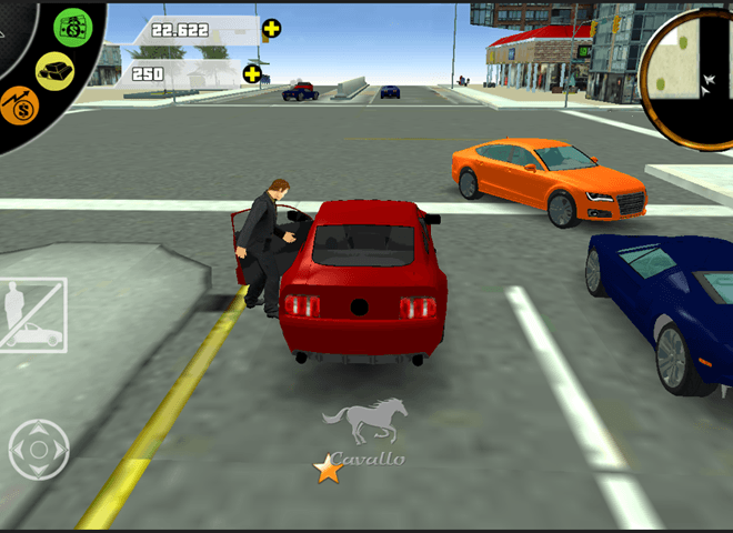 The first image depicts a video game scene with a red sports car in the foreground. The car is parked on the side of a road with a pedestrian standing next to it. The road is lined with a yellow line and there are other cars in the background, including a blue sports car and a red car. The scene is set in a city environment with buildings and a clear sky. There are various icons and text elements floating above the scene, including a speedometer, a timer, and a 'Carallo' text. | Play San Andreas Real Gangsters 3D on pc 5 | 7f8f9e57496a37636ebc5dd74d880012c8acb91f6075357f6078315dca986341 | 001229712516 | 0 | 0 | 92 | 9 | 0 | 0 | |
