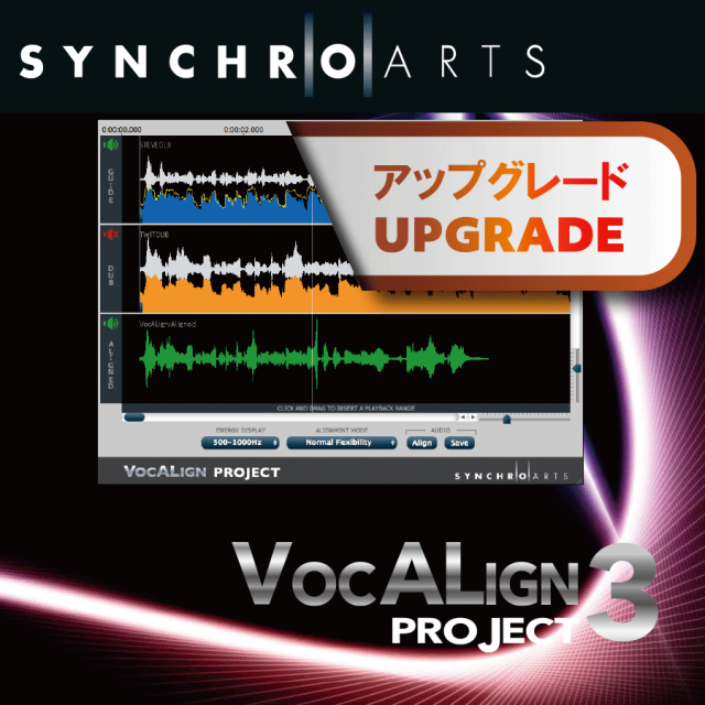 The second image is a promotional poster for the 'Vocalign 3 Pro Project' software. It features a large, colorful upgrade button in the center with Japanese text, surrounded by a waveform display of audio data. The background is a gradient of red and black, and the top of the image includes the 'SYNCHRO ARTS' logo. The overall design is eye-catching and emphasizes the upgrade aspect of the software. | VocALign Project 3 - Upgrade from non-iLok VocALign Project | a504908642c0d9af1d8072d19118546f94b29a80b4b36dc5652f5c4d981be551 | 001229712479 | 0 | 0 | 68 | 9 | 0 | 0 | |