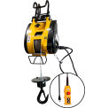 A yellow and black device with a circular base and a handle on top is suspended from a metal hook attached to a chain. Below the device, there is a yellow and black tool with a red button on it, connected to the device by a black cable. The tool is resting on a circular metal plate. The entire setup is against a white background. | OZ Lifting Electric Wire Rope Hoist 500 lbs. | 0f2c7e9e09e7f9f4b691caa977f640ebc9d6b7a8811e064975ffed0b2310895c | 001229712518 | 0 | 0 | 65 | 8 | 0 | 0 | |