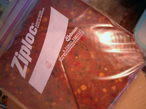 A Ziploc bag filled with a mixture of corn and red sauce is placed on a wooden surface. The bag is partially transparent, showing the contents inside. The Ziploc brand is visible on the top left corner of the bag, and there is a label on the bag that reads 'A Family Favorite'. The contents of the bag appear to be a combination of corn kernels and a red sauce, possibly salsa or tomato sauce. | freezer bag | 7cfd65836dc8f7d35ab982620e4c8145a505ba01b0afbbefb7c59463644514cc | 001229712434 | 0 | 0 | 75 | 2 | 0 | 0 | |