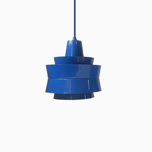 A blue modern pendant light with a cylindrical shape and a pointed top hangs against a white background. | Swedish Blue Trava Pendant Lamp by Carl Thore for Granhaga, 1970s | 5f2c5602eeb65a0906652812adaaf1c9c00e4bf4f7248e6cf2db7658c98c6c62 | 001229712813 | 0 | 0 | 18 | 11 | 0 | 0 | |