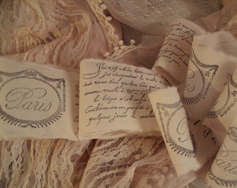 A close-up view of a lace shawl with a detailed design featuring the word 'Paris' in cursive script. The shawl has a textured, woven appearance with a mix of light and dark shades. The focus is on the intricate patterns and the word 'Paris', which is prominently displayed in the center of the image. | French Inspried - Paris Scroll - Hand Stamped Trim - Hand Stamped Ribbon (0146) | 062fa6dd13e720eb456ccffa1a88334402b62bb87d5486bd08ffe4e887eef987 | 001229712586 | 0 | 0 | 54 | 14 | 0 | 0 | |