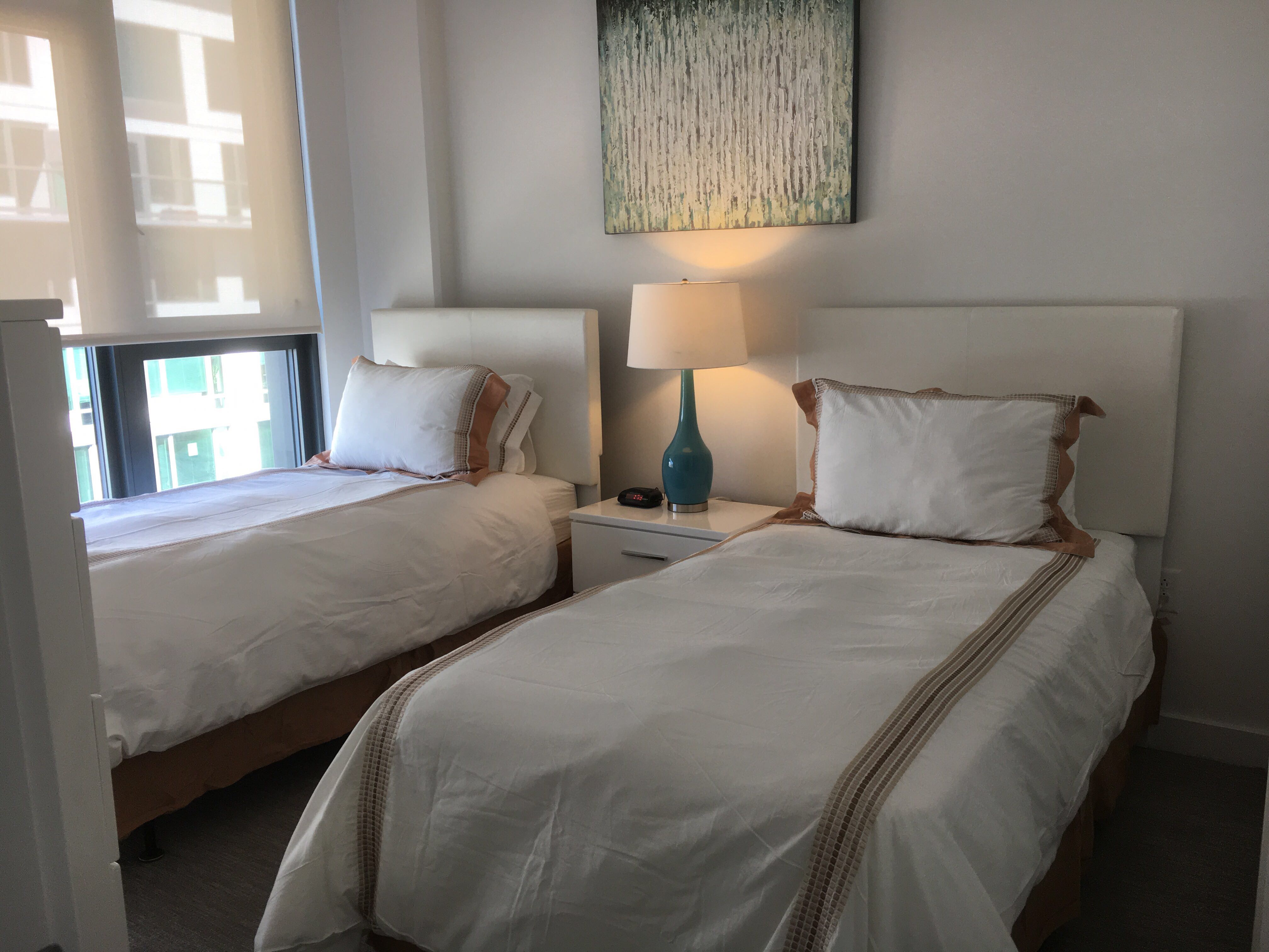 A cozy bedroom with two twin beds, each with a white pillow and a beige blanket. The room has a white wall with a large abstract painting above the beds. There is a white bedside table with a blue lamp and a black remote control on each side of the room. The window has white blinds, and the floor is covered with a beige carpet. | image 8 furnished 2 bedroom Apartment for rent in South of Market, San Francisco | dd4d094573a9a634d1058f40ba557b59bcb8cb07359017893f04e41f82fab358 | 001229712676 | 0 | 0 | 65 | 14 | 0 | 0 | |