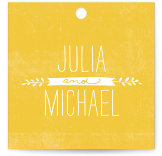A yellow card with a white border and a circular cutout at the top. The card has a handwritten text that reads 'Julia and Michael' in a cursive script. Below the text, there is a decorative line and a small illustration of a leaf. The card has a vintage appearance with a textured background. | Quite Simply Wedding Favor Tags | 3fc503a487d46aff4ddd4053a9245f2a309cc69ee1054b8a7de78fca171a6253 | 001229713048 | 0 | 0 | 54 | 5 | 0 | 0 | |