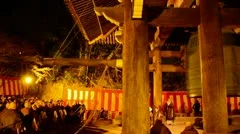 A traditional Japanese temple with a large bell tower, surrounded by a crowd of people in the evening. The temple is adorned with red and white striped banners, and the bell tower is illuminated by warm lights. The scene is set against a backdrop of trees and a clear sky. | Temple bell ringing at Chion-in in Kobe at new years eve with monks Stock Footage | f2af542b61d7eb28a99abc39bee92aea1370aedbc9cfd740749af613b8f97fbc | 001229712957 | 0 | 0 | 50 | 15 | 0 | 0 | |