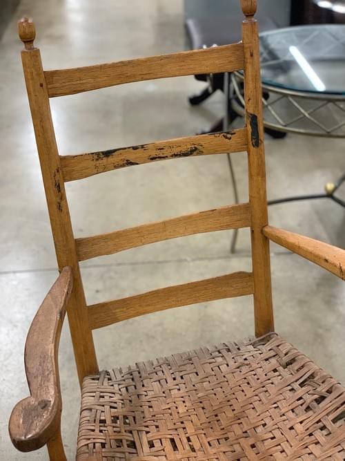 A rustic wooden chair with a woven seat and backrest is placed on a concrete floor. The chair has a curved backrest with vertical slats and a round, turned top. The seat is made of woven reeds, and the chair has a curved armrest on the left side. The floor is grey, and there is a black leather chair and a glass table with a metal frame in the background. | Vintage Farmhouse Rustic Rocking Chair | ad5b64a0a33d5404b25eac951246d97c6def2a0bfec2133cc9d664e5decaea01 | 001229712955 | 0 | 0 | 70 | 5 | 0 | 0 | |