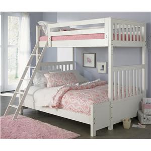 A white bunk bed with a pink and white patterned blanket is set up in a child's bedroom. The bed has a white ladder on the left side and a white rail on the right side. There is a white rug on the floor, and a white basket with a pink handle is placed next to the bed. The room has a purple wall and a window with white curtains. | Transitional Twin Over Twin Bunkbed | bc623a1d76c816b214508ef1aaed0fb986bd496644b758db590cef7f17c19c01 | 001229713483 | 0 | 0 | 70 | 5 | 0 | 0 | |