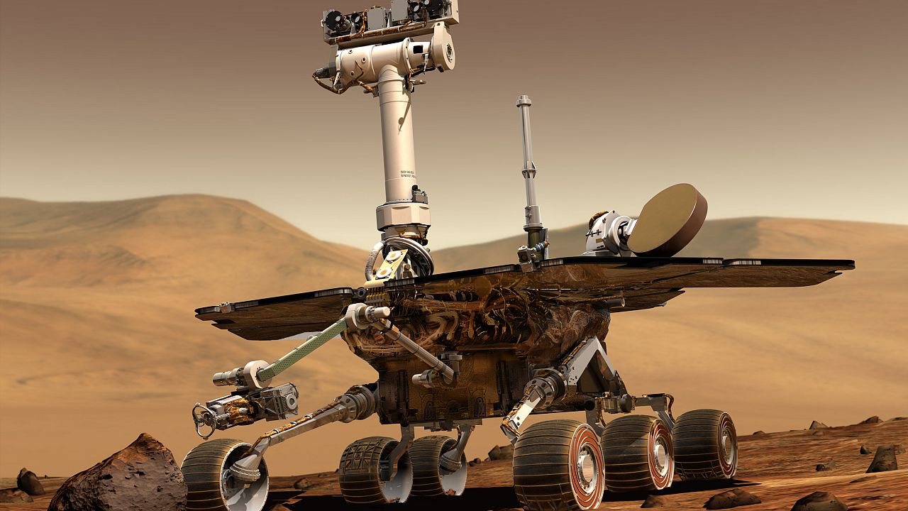 A detailed illustration of a Mars rover with a large dish antenna on its back, a robotic arm, and a camera mounted on top. The rover is positioned on a rocky terrain with a reddish-brown color palette, and the background features a hilly landscape with a clear sky. | Image: Mars Exploration Rover Opportunity | 877ce7210e0fe27d9849c12023edbcdce4b42e35354ba4d723e5364d56b73772 | 001229713600 | 0 | 0 | 48 | 5 | 0 | 0 | |