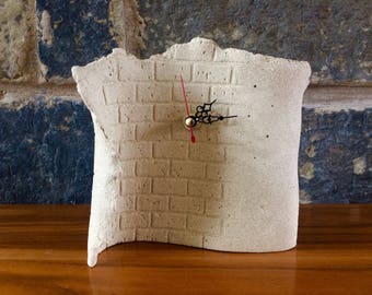 A white clock with a red second hand is mounted on a textured beige brick wall. The clock is positioned at an angle, with the face of the clock visible and the hands indicating the time. The wall has a blue and grey stone pattern, and the clock is placed on a wooden surface. | ceramic stoneware clock brick detail male masculine decor unique pottery homeware | d5575b6002676c1df6976b5ac71470b18745ca61f50a49671879c6226a6b89cb | 001229714217 | 0 | 0 | 54 | 11 | 0 | 0 | |