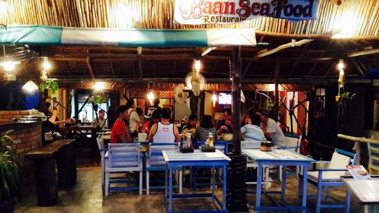A bustling restaurant scene with patrons seated at various tables. The tables are adorned with blue tablecloths and are accompanied by blue chairs. The restaurant has a thatched roof and is decorated with hanging plants and lanterns. The walls are adorned with pictures and the floor is wooden. The patrons are engaged in conversation and enjoying their meals. | Baan Seafood Restaurant | 4bdccdbd9d9a031a788fe250a7242e4301620cc577476d61835e3a8802d58cc6 | 001229714672 | 0 | 0 | 58 | 3 | 0 | 0 | |