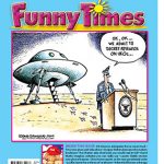 The second image is a comic strip version of the first, with the same scene of the alien spaceship and the man in the astronaut suit standing at the podium. The text bubbles have been replaced with speech balloons, and the image now has a more cartoonish appearance. The background is simplified, and the image is framed with a comic book border, complete with a title 'FUNNYTIMES' and a copyright notice at the bottom. | Funny Times July 2019 Issue | 1ccdb3c67a9bd3a575bda401145b6fd5ab9de9ade25e0ee0d4fe497dbe265440 | 001229714702 | 0 | 0 | 74 | 5 | 0 | 0 | |