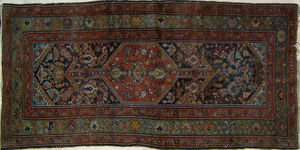 A close-up view of a detailed and colorful Persian rug with intricate patterns and a rich array of colors including red, blue, and beige. The rug is adorned with a central medallion surrounded by a variety of geometric and floral motifs. The texture of the rug is visible, showcasing the fine craftsmanship of the weavers. | Hamadan throw rug, ca. 1920, 7' x 3'5 | 66d4be1e75b7eeac4037fc84554588963b99e72e04f5751169e2be9bd4ff9944 | 001229714724 | 0 | 0 | 55 | 8 | 0 | 0 | |