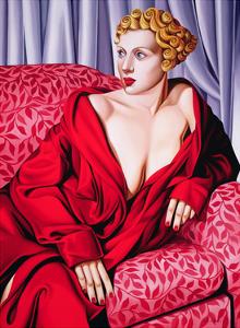A stylized illustration of a woman with blonde hair wearing a red dress, sitting on a pink couch with a floral pattern. She has red nails and is looking directly at the viewer. The background features a curtain with a similar floral pattern. | Red Kimono, 2001 by Catherine Abel | 599852a9736c26e9851def91105f8e46e28ffe80d7ff62c1e9740edb9a261eda | 001229714614 | 0 | 0 | 43 | 6 | 0 | 0 | |