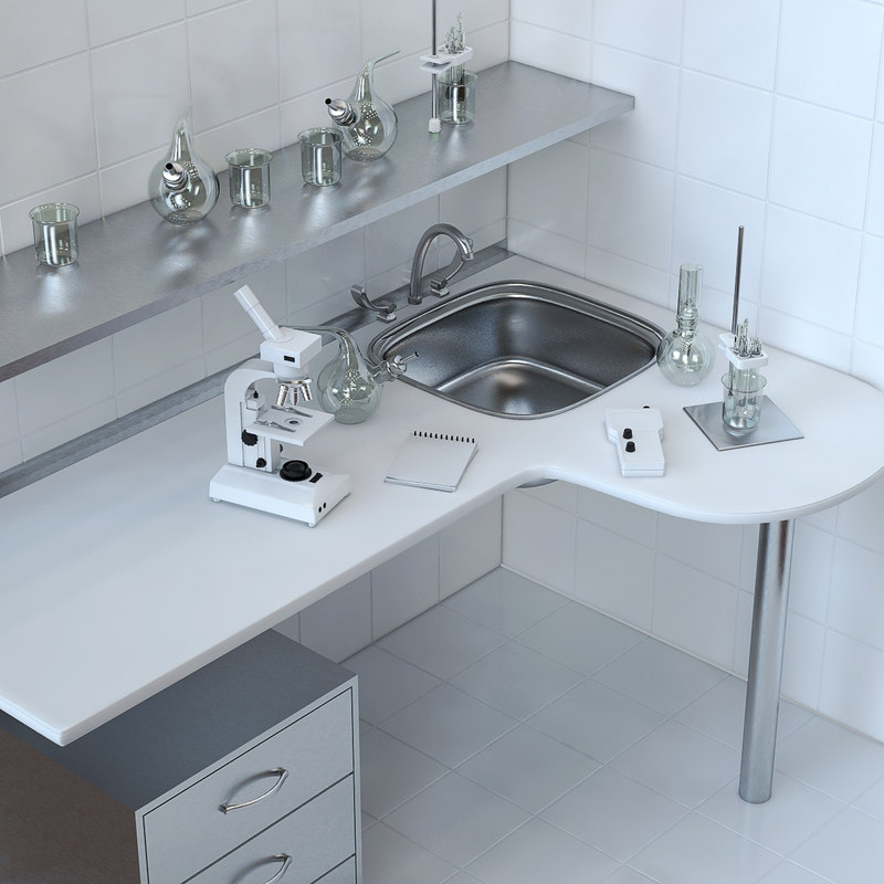 A modern laboratory setup with a stainless steel sink, a microscope, and various glassware on a white countertop. The countertop is supported by a metal frame, and there is a white tiled floor. The wall behind the countertop is tiled with white square tiles. | 3dsmax research laboratory | 4649f0ca28b7b430f9113e7fae25be7faba57e8ffbade19f620b35138b48c988 | 001229714593 | 0 | 0 | 44 | 3 | 0 | 0 | |