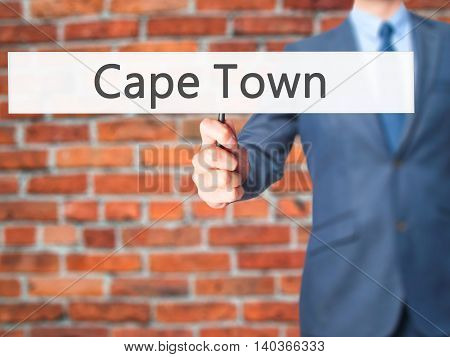 A man in a blue suit is holding a sign with the word 'Cape Town' on it. The sign is white with a black border and is placed against a brick wall background. The man's hand is positioned as if he is holding a pen, and the sign appears to be floating in front of him. | Cape Town - Business Man Showing Sign | fe09c1efd72929eb897f847f7f6aaa0633b8f1890f50b22fc62cf16a899c9886 | 001229714634 | 0 | 0 | 56 | 7 | 0 | 0 | |