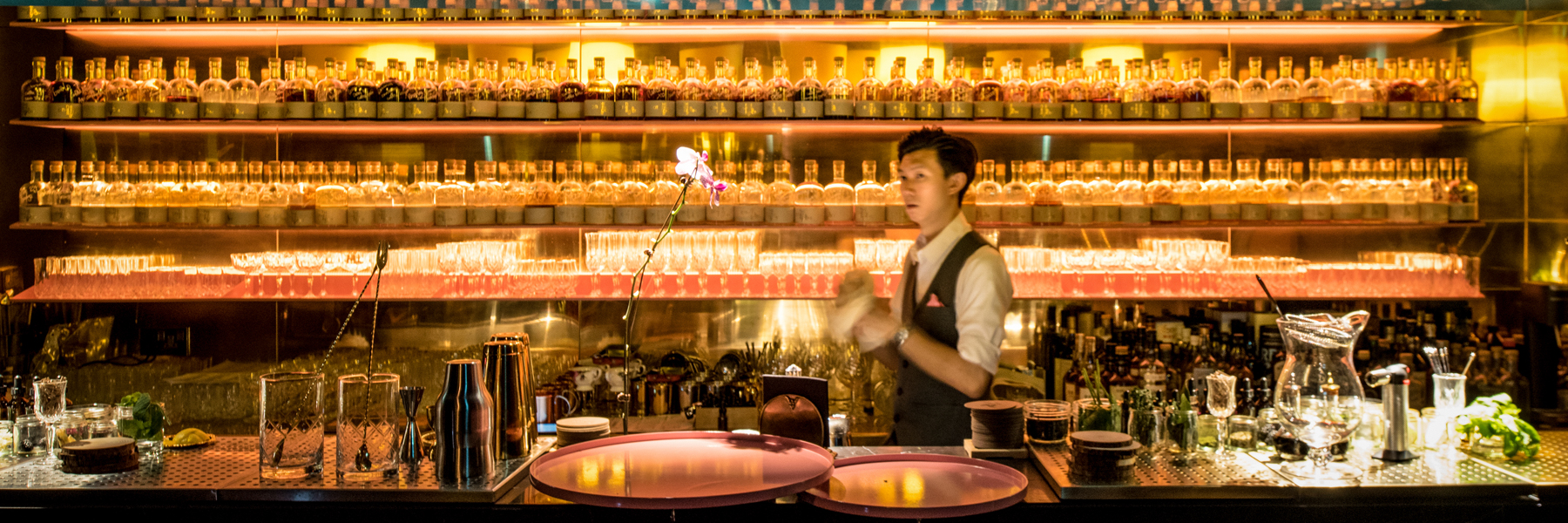 The first image shows a bartender standing behind a bar with a variety of bottles and glasses. The bartender is wearing a white shirt with a black apron and is holding a cocktail shaker. The bar is well-lit, with a warm glow emanating from the shelves of bottles and the glassware. The image has a vibrant and inviting atmosphere. | lagranja design deliver a cocktail influenced interior for other room bar in singapore | a9c640a816d792f8badc10cbe13a7da55010f2c2560b5494795eec7cb0e1dc73 | 001229714654 | 0 | 0 | 59 | 13 | 0 | 0 | |