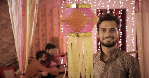 A man is standing in front of a decorative lantern with a red and yellow pattern. The lantern is hanging from a string of lights that are also lit up. The man is wearing a patterned shirt and has a beard. In the background, there are two other people sitting on a bench, and the scene appears to be set in an indoor area with a festive atmosphere. | A smiling handsome man hanging a Diwali traditional lantern during the festival. A young happy male wearing kurta hanging colorful Diwali Kandil while his colleagues sitting in the background | face463cdba4899abf6d182b9fdb856b4092de5ddaa471ec796e16a90696a245 | 001229715007 | 0 | 0 | 68 | 29 | 0 | 0 | |
