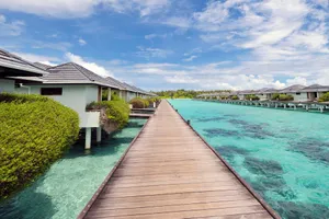 A wooden pier extends into a calm turquoise lagoon, flanked by lush greenery and a row of traditional houses with triangular roofs. The sky is partly cloudy, and the water is clear, revealing the sandy bottom of the lagoon. | Impresii Maldive - Paste 2021 | 12087ada43c7800292dc3608e74fe4dcde8262ecf5657ca4bda1bbc176353676 | 001229714929 | 0 | 0 | 39 | 5 | 0 | 0 | |