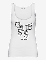 A white tank top with the word 'Guess' in a decorative font on the front, featuring a silver sequin design. The tank top has a tag on the back with the brand name 'Guess' and the number '1983'. | GUESS Jeans - ARLENE TANK TOP - linnen - true white a000 - 0 | f1cbce3e3aa89c7e8c188579277fc86617ce8cfea1b00be911e19f856a596a68 | 001229714991 | 0 | 0 | 38 | 14 | 0 | 0 | |