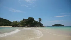 A serene beach scene with clear blue skies and a calm sea. The beach is lined with lush greenery and a few rocks near the water's edge. Gentle waves are lapping onto the sandy shore, creating a peaceful atmosphere. | Beautiful beach and tropical sea Stock Footage | faafb472d32c3038ab1cbcb6e43a7bbfe92d31ddadc22f6624928f317c1e9880 | 001229715001 | 0 | 0 | 39 | 7 | 0 | 0 | |