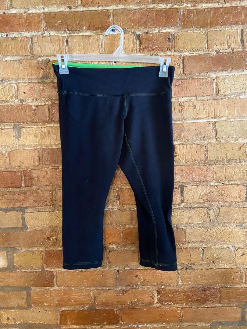 A pair of black athletic shorts with a green waistband is hanging on a hanger against a brick wall. The shorts have a black waistband with a green stripe and a small white logo on the left side. The brick wall has a warm, earthy tone and the shorts are positioned in the center of the image. | Lululemon capris. Size 8 reversible legging | 4fc0cd1bdf5efc1ebf9b05f5563324b234afafae1fa3080804bf5855745f4c40 | 001229714878 | 0 | 0 | 57 | 6 | 0 | 0 | |