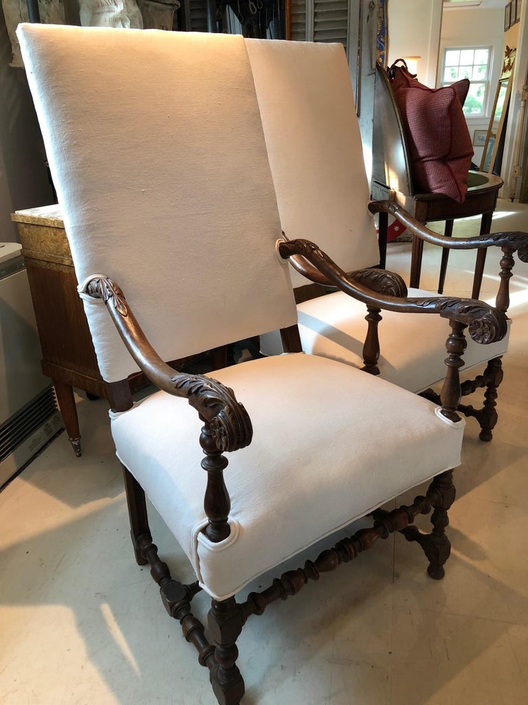 A vintage wooden chair with ornate carvings and a white cushioned seat is displayed in a room with a wooden floor, a radiator, and a window with a view of a garden. | Impressive Pair of Beautifully Carved Regal French Armchairs For Sale 3 | 420f3ab66d54c548609f104925d7e60ee42ca42e2255303de223ad4a3a584e21 | 001229715628 | 0 | 0 | 32 | 11 | 0 | 0 | |