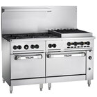 A stainless steel commercial kitchen range with six burners, two ovens, and a grill. The range has a flat top and is equipped with a vent hood above it. | Vulcan 60SC-6B24CBN Endurance Natural Gas 6 Burner 60 inch Range with 24 inch Charbroiler, 1 Standard, and 1 Convection Oven - 302,000 BTU | 80ea944cb2310dfe1952f579d0c386888e9a16d87f92a53b68afbbf2de4e8710 | 001229715624 | 0 | 0 | 29 | 23 | 0 | 0 | |