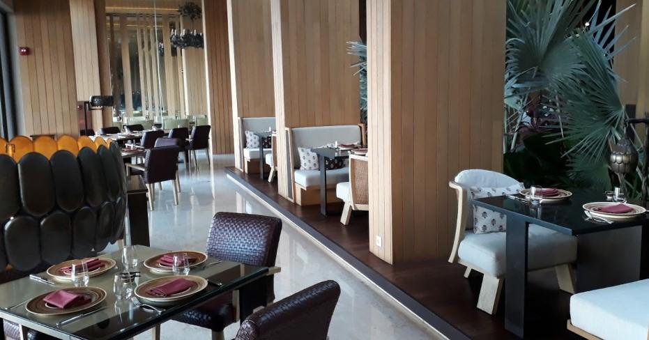 The first image shows an interior of a restaurant with a modern design. The room has a wooden floor and walls, and the ceiling is made of wooden panels. There are several tables with chairs around them, and the tables are set with plates, glasses, and silverware. The chairs have a patterned fabric. The room is well-lit, and there are large windows that allow natural light to enter. There are also decorative elements such as a tall vase with yellow flowers on the left side of the room and a large potted plant on the right side. | Bejana, Indonesian Restaurant at The Ritz-Carlton, Bali | a5ea19dae278e6277f77c83fcee08d306a0853d0b41c4bde15a237ea1132da1f | 001229715517 | 0 | 0 | 97 | 7 | 0 | 0 | |