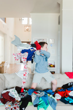 A young boy is standing on a couch with his arms outstretched, holding a large pile of clothes. The clothes are a mix of shirts, pants, and a jacket, all in various colors and patterns. The boy is wearing a striped shirt and shorts, and his hair is short. The room has a modern design with a large chandelier hanging from the ceiling, and there is a bookshelf in the background filled with books and decorative items. | Emily Ley's son throwing clothes while standing on their couch. | 72e2e7d47b91fbdea04d46bf33803885cb5c346e45b9f4bf2d47431cc475e6a3 | 001065758444 | 0 | 0 | 77 | 10 | 0 | 0 | |