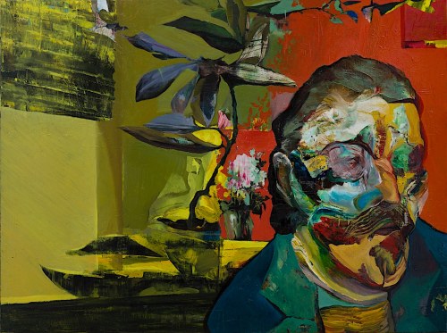 A painting of a man with a distorted face, featuring a mix of realistic and abstract elements. The background includes a vase with flowers and a plant with large leaves, all rendered in a style that blends realism with abstract expressionism. The painting has a vibrant color palette with a focus on blues, greens, and yellows. | Tomasz Tobolewski, Gauguin, 2019 | 1497bcf9bc015216a7ad6b9f2b9adcf1a5e76aae33fb772cd85ad697e9a15781 | 001065759525 | 0 | 0 | 56 | 4 | 0 | 0 | |