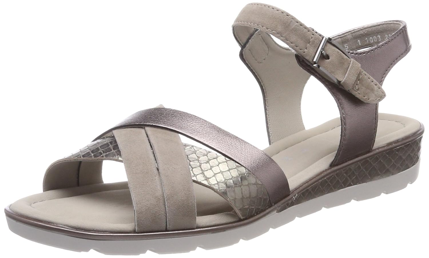 A pair of beige sandals with a metallic buckle and a woven design on the straps. | Beige (Taupe, Street 12) ARA Damen Alassio Offene Sandalen | 28d50925fc3c6ea442204572eec0f6559d111314f1a7c1d42de3f2b0f385ffea | 001065759999 | 0 | 0 | 16 | 9 | 0 | 0 | |
