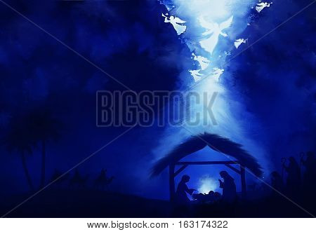The second image shows the same night scene with the addition of a large, stylized 'BIGSTOCK' watermark in the bottom right corner. The image is brighter and more vibrant, with the colors appearing more saturated. The scene is more illuminated, with the light from the manger and the surrounding area being more pronounced. The overall effect is a more dramatic and visually striking image. | Christmas night in Bethlehem when Jesus was born | 8e8f0fe1ec531dcbef5e7a14264808342e43d51b59a6a5b770bff73b776875ad | 001065760044 | 0 | 0 | 64 | 8 | 0 | 0 | |