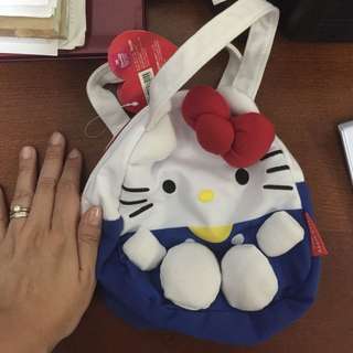 A white Hello Kitty bag with a red bow on top is placed on a wooden surface next to a person's hand. The bag has a blue base with white Hello Kitty designs and a yellow Hello Kitty face on the front. The person's hand is wearing a ring on the ring finger. | original hello kitty bag by sanrio | aa7ba721202707064d360078094f7cb65e1e35065ccc195a73b1c11765ef1c31 | 001065760233 | 0 | 0 | 53 | 6 | 0 | 0 | |