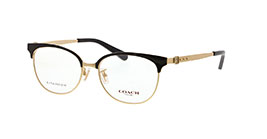 A pair of eyeglasses with a black frame and gold accents is displayed against a white background. The lenses are clear, and the brand name 'CHOM' is visible on the lower part of the left lens. The temples of the glasses have a gold hinge and a black tip. | Kacamata Coach HC5093TD col 9086 s54 | 45fe44620cf3a84f6c4da2aa4d21da1445a9491f882c6e516ef413e30f120a11 | 001065760097 | 0 | 0 | 49 | 6 | 0 | 0 | |